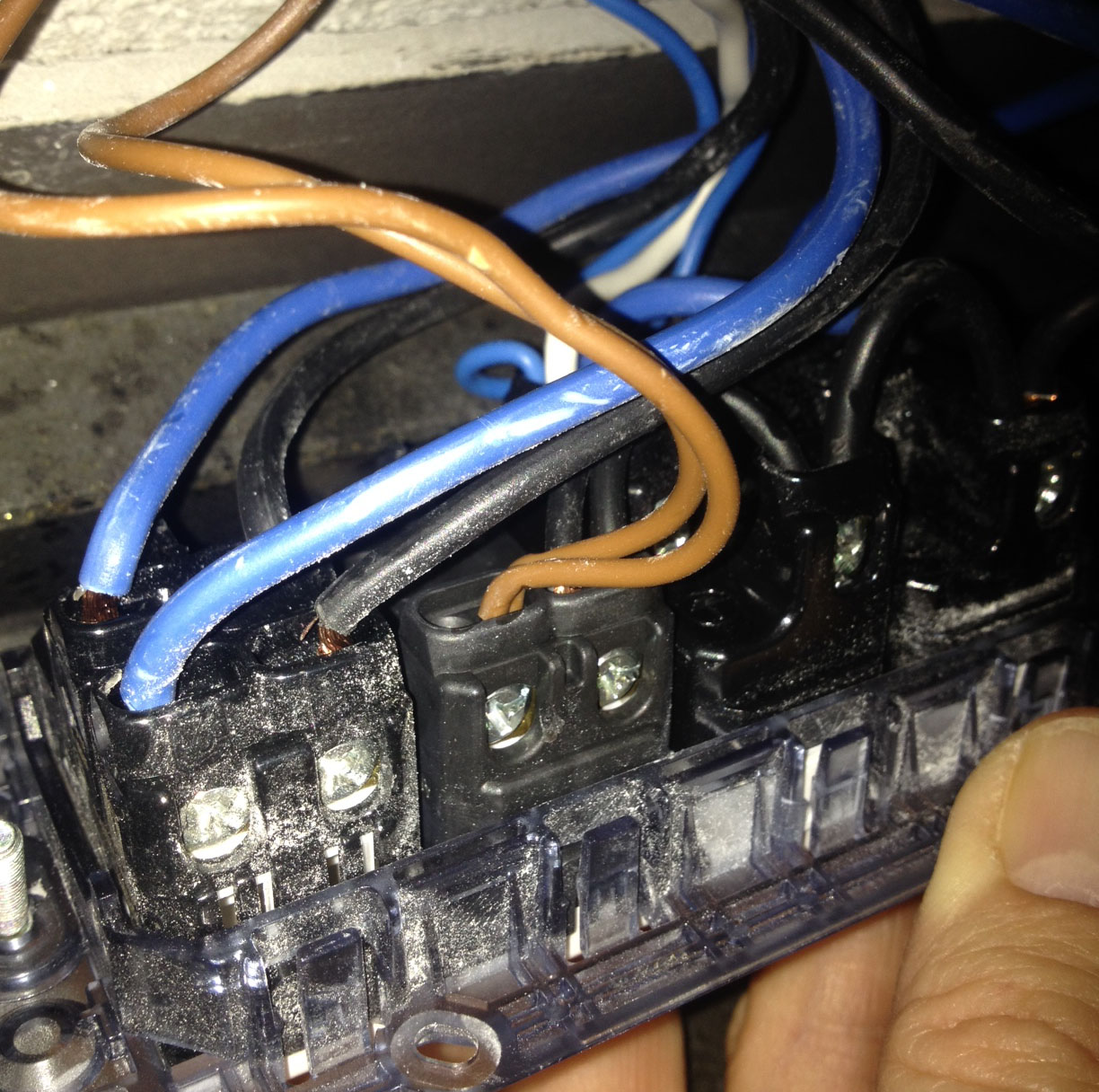 Ad interruttore spento (trovate le foto allegate, l'interruttore è all'estrema sinistra) trovo col cercafase una fase normale sul nero sopra, e sotto una flebile fase sia sul blu che sul nero. Sulla presa flebile fase sia sul blu che sul nero.
