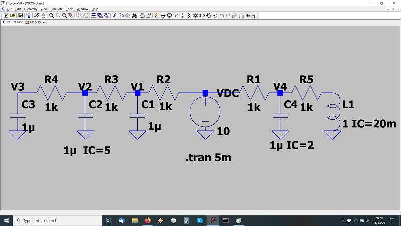 The .ic directive allows initial conditions for transient analysis to be specified. Node voltages and inductor currents may be specified. A DC solution is performed using the initial conditions as constraints. Note that although inductors are normally treated as short circuits in the DC solution in other SPICE programs, if an initial current is specified, they are treated as infinite-impedance current sources in LTspice