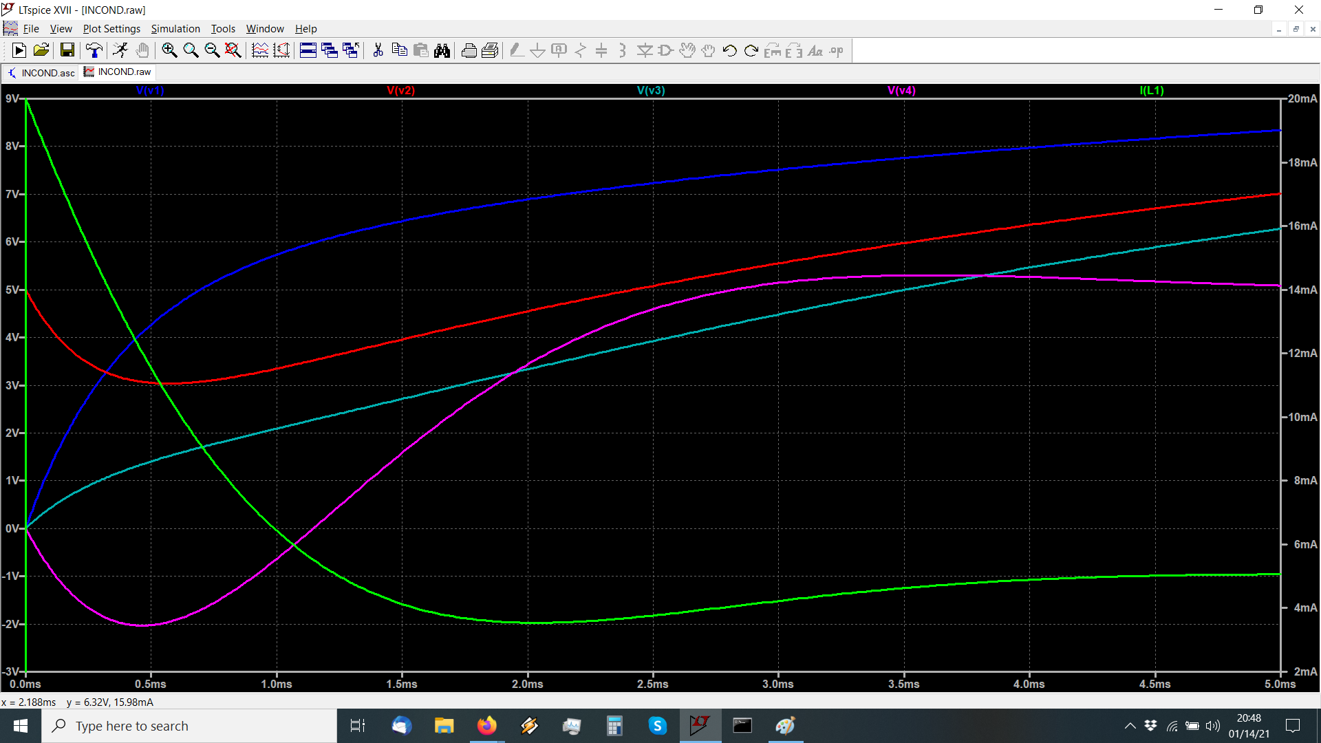 SI vede che le tensioni su tutti i condensatori sono nulle, tranne C2, ma questa tensione di 5V non si "propaga" su C3. Questa volta la condizione iniziale sull'induttanza e` presente, la corrente I(L) parte da 20mA, ma questa "corrente" non scorre da nessuna parte, non va a caricare inizialmente C4, che parte anche lui da tensione nulla.