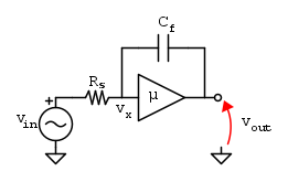 è sufficientemente elevato, è circa 1):In questo modo, se l'impedenza di ingresso dell'amplificatore è infinita e quella di uscita nulla, significa rispettivamente che il polo è dato semplicemente dalla C in ingresso (che forma un passa-basso con la R) e che la C in uscita non entra in gioco.