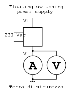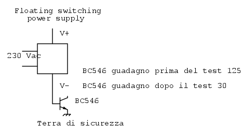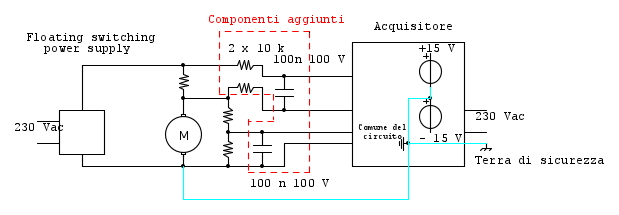 - il motore e' connesso alla terra di sicurezza (dove si scarica la corrente "parassita" del "floating switching power supply") e al comune dell'alimentazione del circuito - linea celeste.