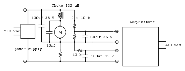 Ho aggiunto un choke da 330uH e due condensatori 100uF e 10 nF per togliere il piu possibile il rumore generato dal motore a spazzole.