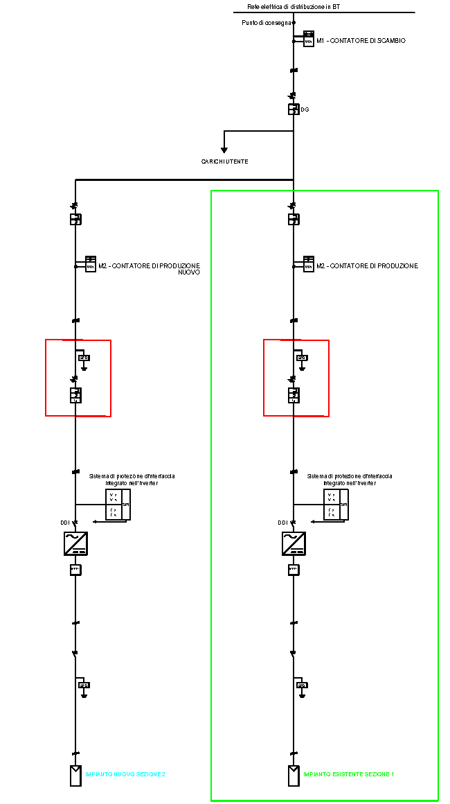Se dovessi aggiungere una nuova sezione in quanto l'impianto già esistente gode di un incentivo diverso da quello che è previsto per il nuovo impianto, è corretto lo schema che ho postato (il parallelo delle due sezioni avverrebbe comunque in testa al magnetotermico differenziale (presente nel quadro di casa) in cui sono già collegati fase e neutro dell'impianto fotovoltaico esistente)?