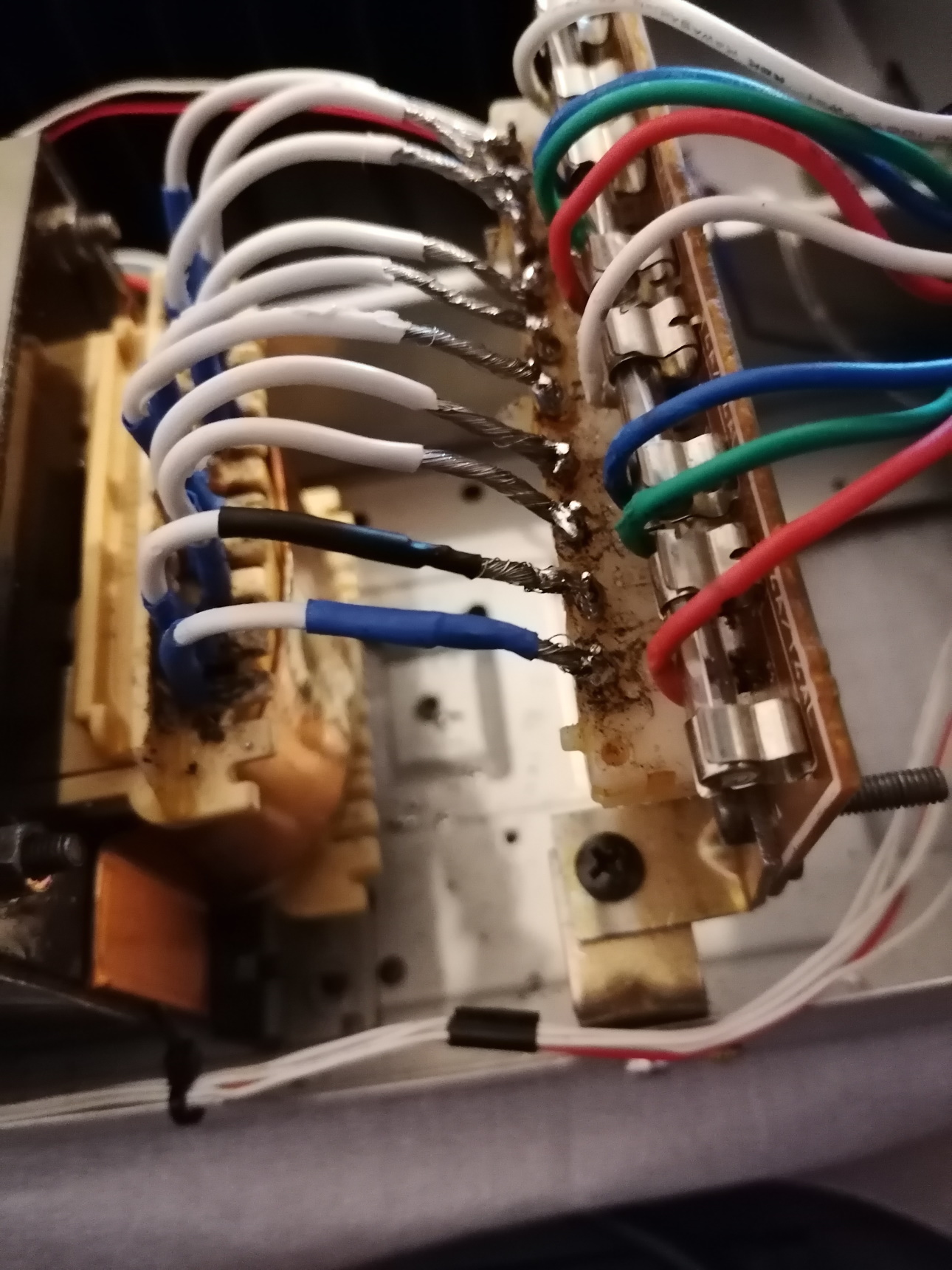 Per quello che riesco a vedere dalle foto che hai postato, molti di quei fili non sono affatto stagnati o comunque non lo sono correttamente, probabilmente a causa di parte della lacca isolante che e' rimasta sul filo, capisco che rimuoverla correttamente dai filettini che escono dal trasformatore puo essere difficile a causa della loro lunghezza (molti restauri e riparazioni richiedono tanta pazienza ;-) ), ma almeno usando filo stagnato ti risparmieresti il problema di rimuoverla anche dai fili usati come prolunga :mrgreen: