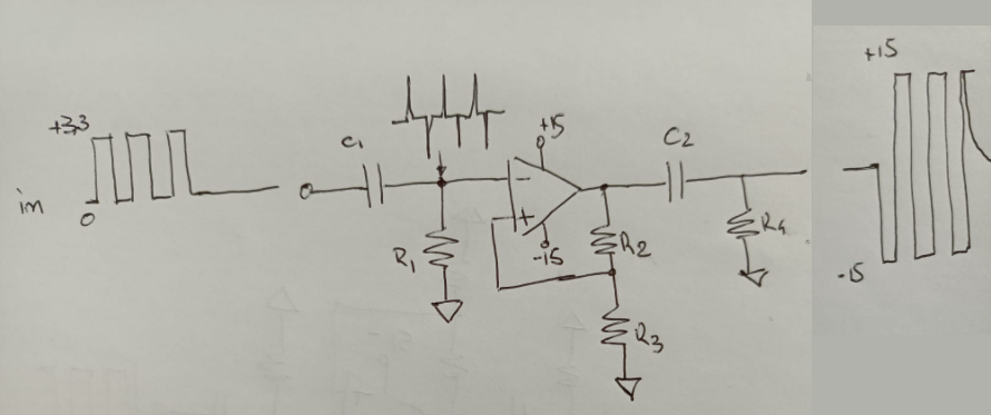da -12V a +12V nel periodo iniziale dell'onda (quindi quando ho la serie di 3 o piu' impulsi, con -12V quando l'input sta a 0, +12V quando l'input sta a 3V) e 0V nel periodo rimanente?