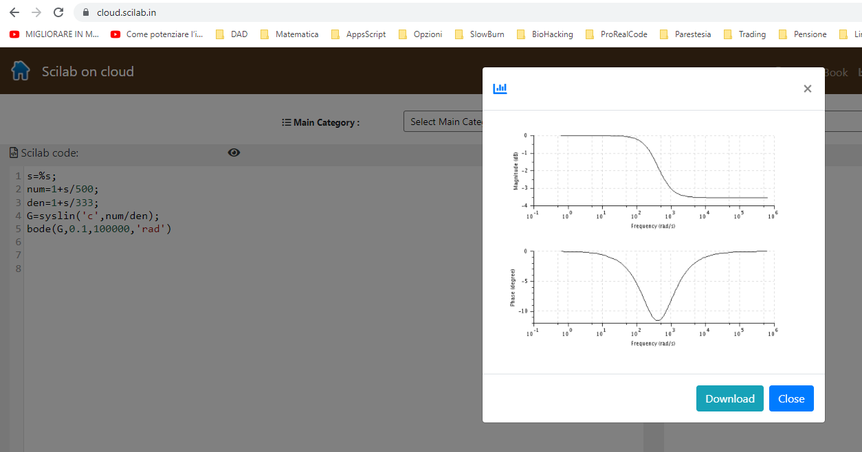 L'immagine è l'esecuzione, appunto su cloud, della richiesta dei due grafici di Bode per la fdt indicata nell'immagine stessa (è la fdt di una rete correttrice).
