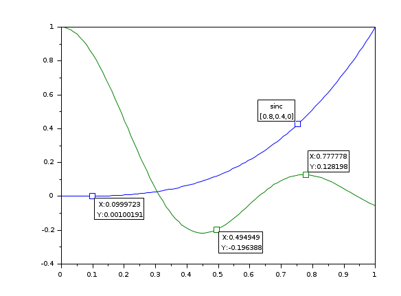 Proprio ai fini di un'ispezione più accurata, Scilab rende disponibili i "datatip": molto comodi per vedere i valori delle coordinate relativamente ad un determinato punto della curva (come nell'esempio di questa immagine).