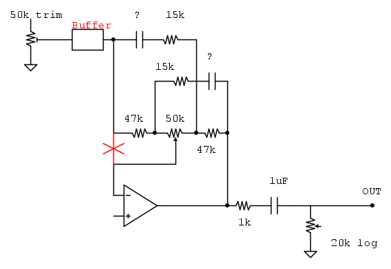 1) tra il trim da 50 k e l'ingresso del Tilt Equalizer filter ci deve essere un buffer (Op-Amp a guadagno unitario, Emitter Follower...) perche' il filtro deve essere pilotato da un generatore con impedenza di uscita "zero" affinche' siano rispettate le frequenze calcolate