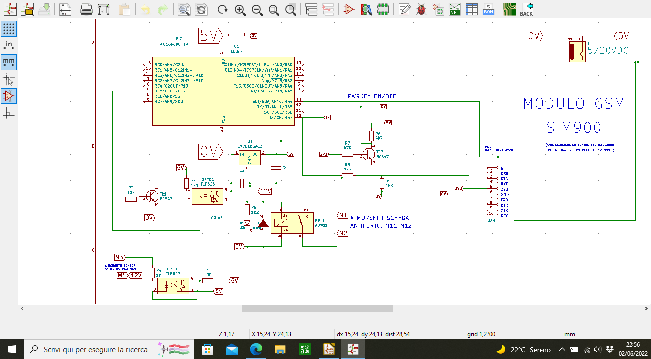Buonasera a tutti. Ho creato un circuito elettronico che, alimentandolo a 12 v dc, alimenta un modulo GSM e, mediante un 78l05 mi crea un 5 v per alimentare un PIC che a sua volta agisce su optoisolatori e transistor; il problema è che, tramite un led posto in parallelo alla bobina di un relays, vedo che ogni tanto, durante il funzionamento, lampeggia e non capisco il perché; posto lo schema del circuito affinchè per favore possiate darmi una dritta per eliminare questo disturbo, grazie.