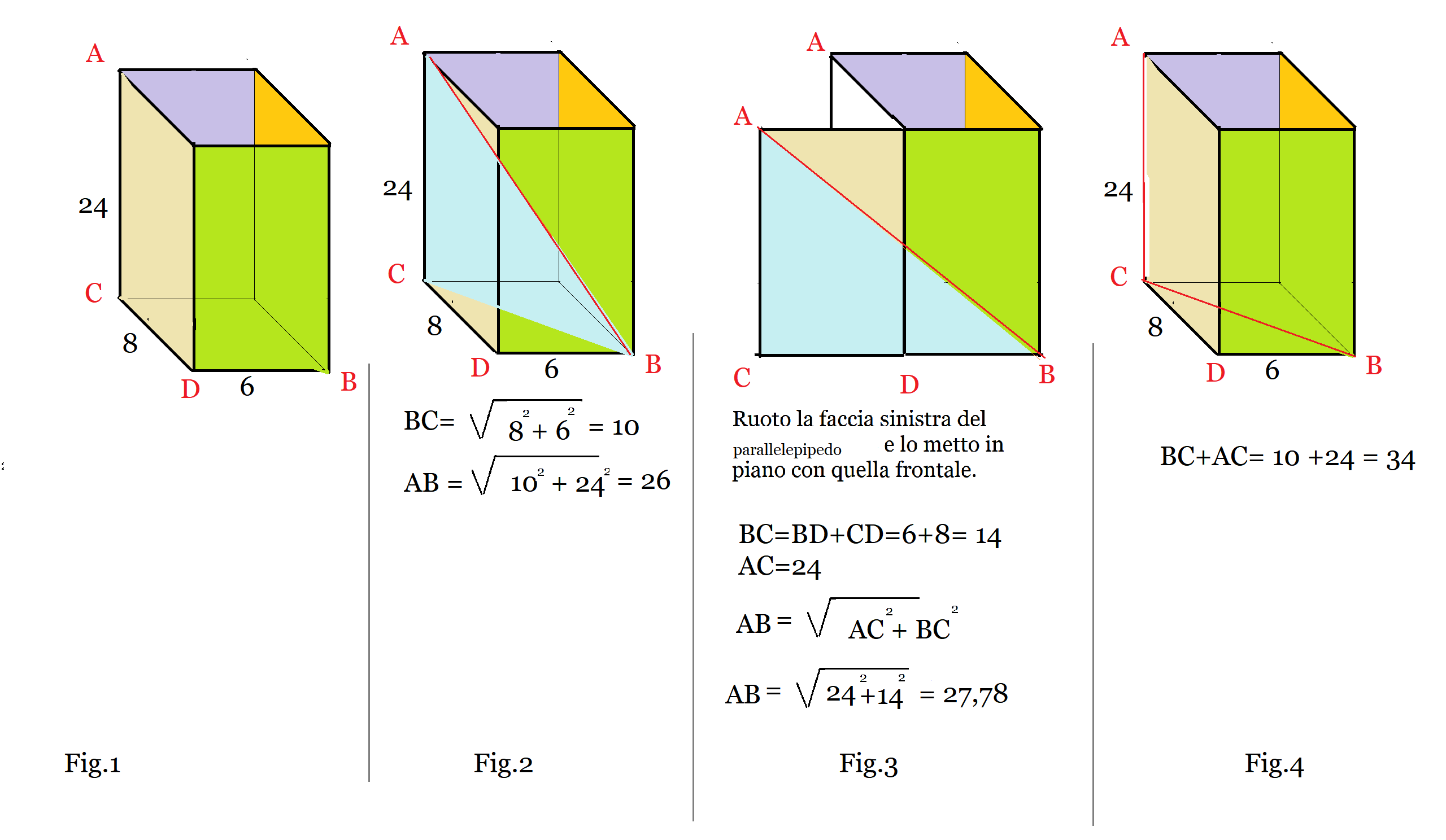 2) Il percorso più breve ma vincolato a toccare la superficie,una formica che parte da A e raggiunge B.