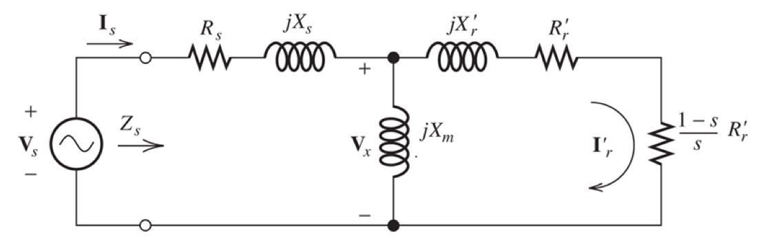Calcolare le prestazioni di un motore asincrono trifase con collegamento a triangolo con 8 poli, 400V efficaci e 50 Hz. Il circuito equivalente è riportato in figura con parametri Rs= 1 Ohm, Xs= 2 Ohm, Xm= 35 Ohm, R'r= 0.5 Ohm, X'r= 1 Ohm. Sotto carico la macchina opera a 742.5 giri al minuto. Considerando le perdite di rotazioni trascurabili calcolare: