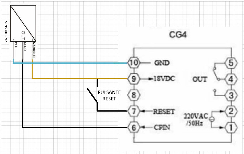 Poi collego il sensore PNP come indicato in figura 6, e qui nasce la prima domanda: perché in figura dice che il filo NERO va portato agli ingressi IN1, IN2 e fino a qui tutto chiaro, ma anche agli ingressi RST e GT?