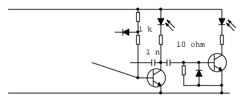 Consiglio volante ... se "sprechi" un terzo transistor con cui pilotare il led, e lo accoppi in AC (attraverso un condensatore ed una resisitenza da base a massa) all'uscita dell'astabile che hai disegnato, non ti serve avere tempi diversi sull'astabile ne particolari accorgimenti, perche' il tempo di accensione lo decidi tu con la costante di tempo dell'RC di accoppiamento, inoltre non potra' mai rimanere acceso di piu, essendo appunto accoppiato in AC (anche se all'accensione rimanesse in conduzione per piu tempo il transistor di uscita, il led farebbe comunque solo un'impulso)
