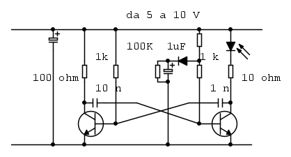 Questo che ho scritto capita se all'accensione la tensione di alimentazione arriva bruscamente, se invece arriva lentamente succede che durante la salita della tensione il primo transistor ad entrare in linearità è T1 e solo verso la fine T2, quindi il led resta spento per quasi tutta la salita, poi, appena entrambi i transistor sono in linearità, quindi con il led appena acceso e con il condensatore da 33nF che durante la lenta salita si è caricato, entrambi i transistor vanno in piena conduzione e il led si accende definitivamente.