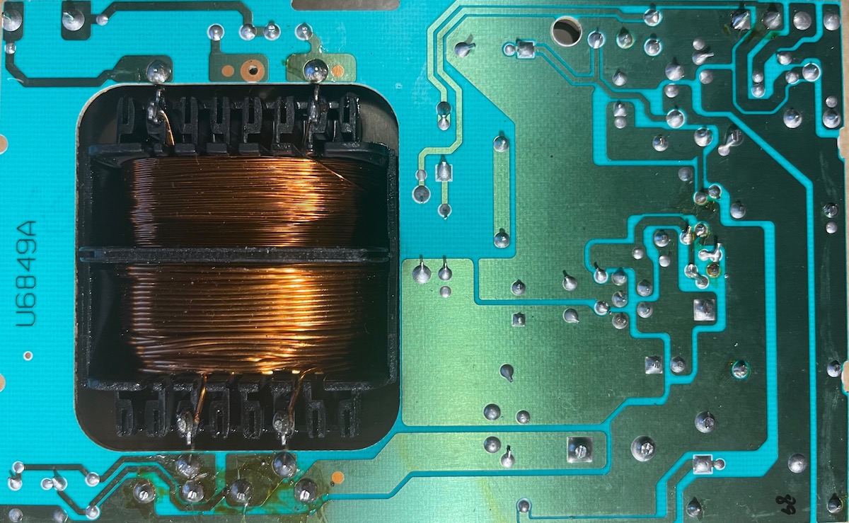 Non ho disponibile ora l’alimentatore bruciato. Ecco comunque un paio di foto. A parte l’annerimento del contenitore dietro il trasformatore, non si notano componenti danneggiati, esternamente almeno