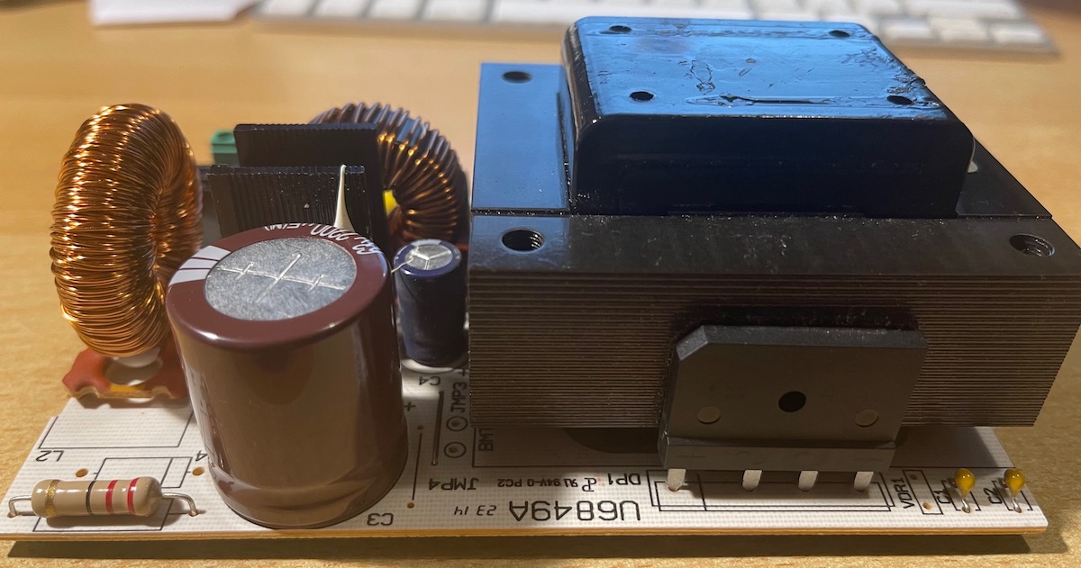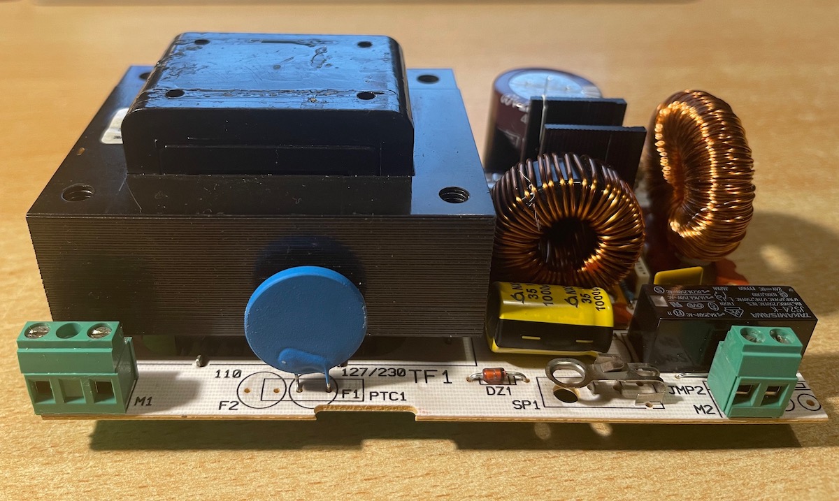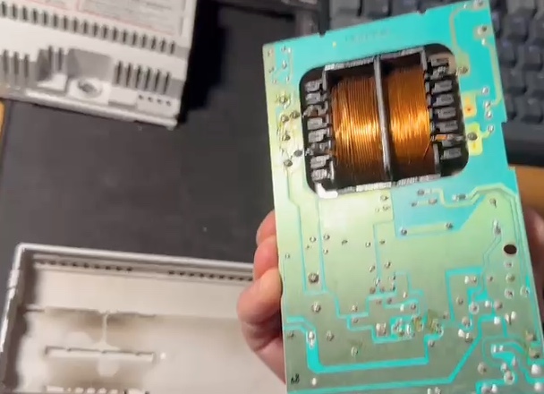 Non ho disponibile ora l’alimentatore bruciato. Ecco comunque un paio di foto. A parte l’annerimento del contenitore dietro il trasformatore, non si notano componenti danneggiati, esternamente almeno