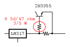 Un (parziale) soluzione quick and dirty e' indicata nello schema qui sotto - inserire una resistenza da 56 o 47 ohm da 3 o 5 W in serie alla base del 2N3055.