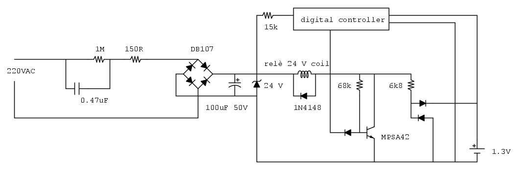 Il circuito , nonostante una forma d' onda deformata nella corrente ( ma comunque con tratti molto simili ad una sinusoide) si può trattare come un semplice circuito in corrente alternata di rete( prima del ponte di diodi) allo scopo di riparazione , pertanto la corrente nel circuito deve essere circa poco più di 30 mA sia a riposo che quando il relè è eccitato.