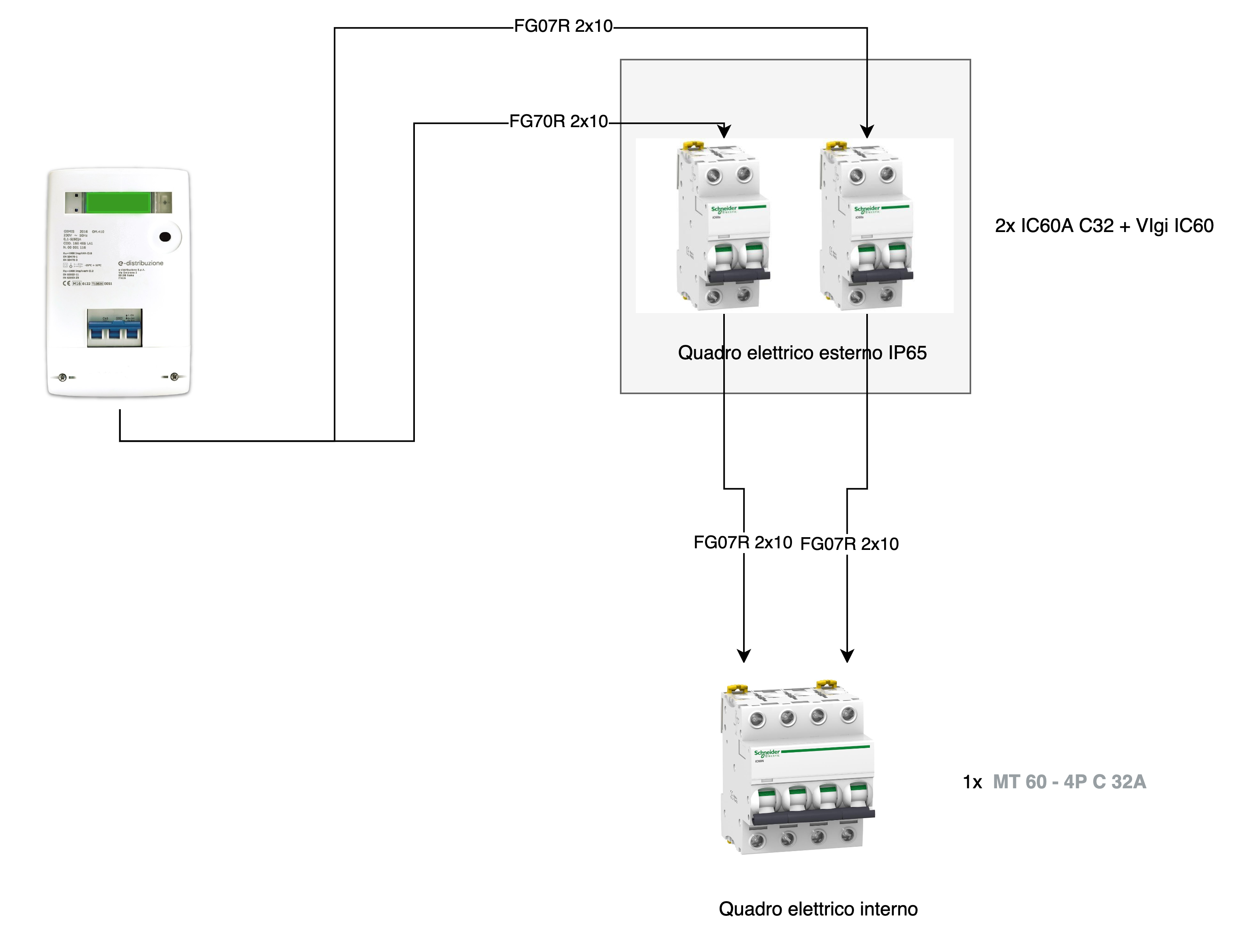 La mia ipotesi era di sostituire dati i 10 kW i due cavi FG07R 2x10 con un unico FG16R 2x16 diretto dal contatore enel al quadro generale e sostituire l'MT60 con un IC60N C63