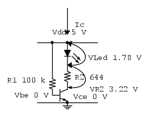 Sostituisco con i valori delle tensioni V_{CE} = 0.2, V_{BE} = 0.7, V_{LED} = 1.78, delle resistenze R_C = 322, R_B = 100000 e del guadagno \beta = 100 lasciando come incognita V_{DD}.
