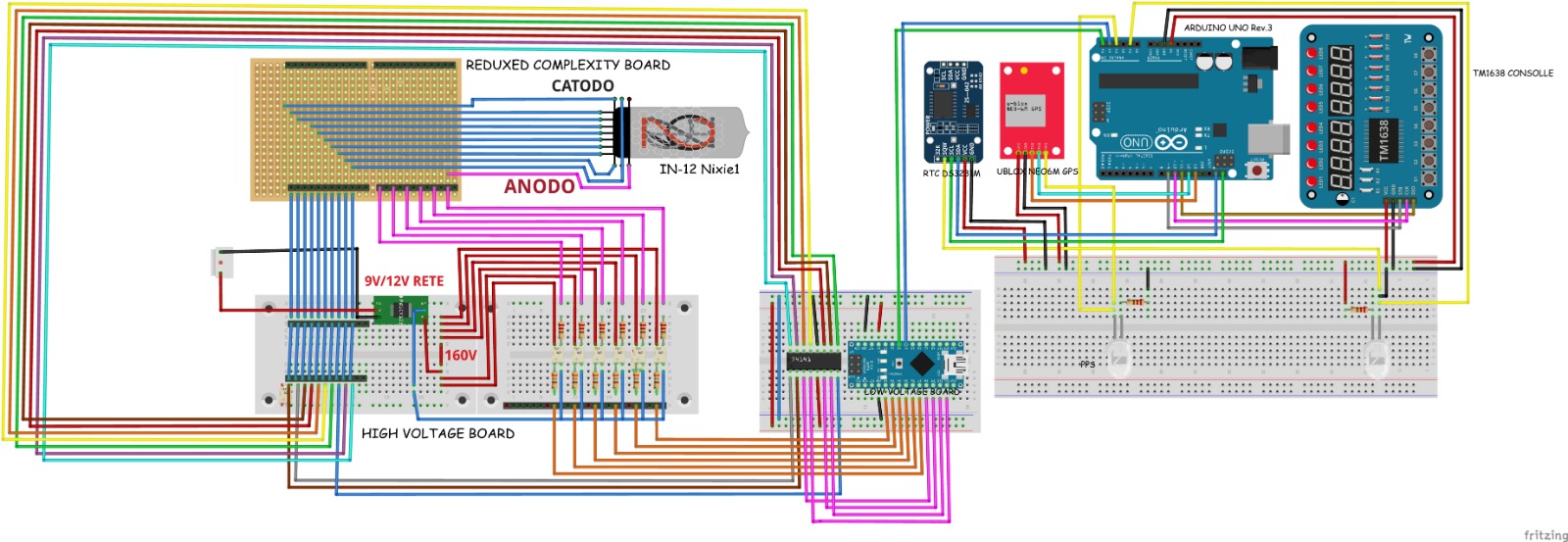 Nel progetto in foto un mio amico ha avuto l 'idea di aggiungere ubn secondo display non a nixie per visulaizzare in parallelo ad orario primario nixie: 1) data 2) num sat 3) temperature ) 4 ) coordinate.