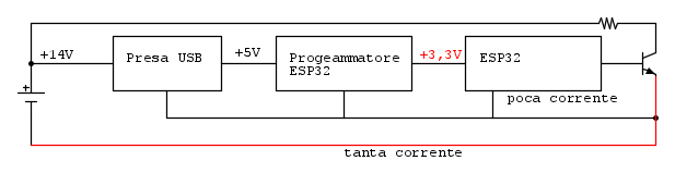 L'ESP32 è molto energivoro perché è attivo il Wi-Fi, infatti consigliano un alimentatore esterno al programmatore altrimenti è insufficiente (Fatto, partendo dalla 5V del primo blocco - USB).