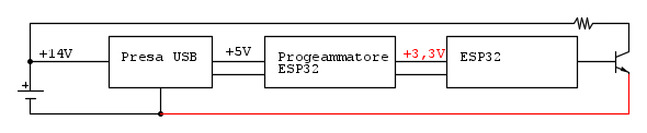 Da una batteria alimento una presa USB da pannello (credo con Step-Down), la quale alimenta un programmatore per ESP32 con convertitore di livelli e alla fine ho il mio ESP32.