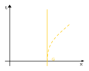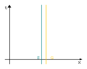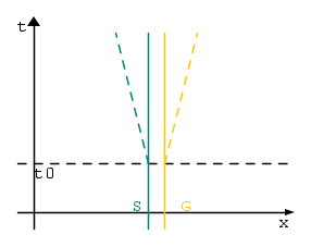 Sono nello spazio abbracciato ad un macigno, abbiamo entrambi una massa maggiore di zero ma non tanto grande da percepire la reciproca attrazione gravitazionale. Stiamo seguendo le traiettorie celeste e gialla, ci muoviamo solo nel tempo e siamo fermi nello spazio, stiamo seguendo due geodetiche parallele: