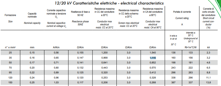 Avendo 1 km di linea fino alla cabina di consegna con il DG nel vano utente ed avendo solo 42 A max di corrente in MT, metterei un 3x35 mmq, il che ha una portata 156 A nel mio caso che è ben oltre i 42 A e avrei una caduta di tensione trascurabile (trascurando la reattanza di serie che è 1/10 della resistenza di serie, si avrebbero 81 V rispetto a 20 kV) ed una perdita di potenza trascurabile (7,3 kW che rispetto a 1.3 MW possiamo dire di essere trascurabile).