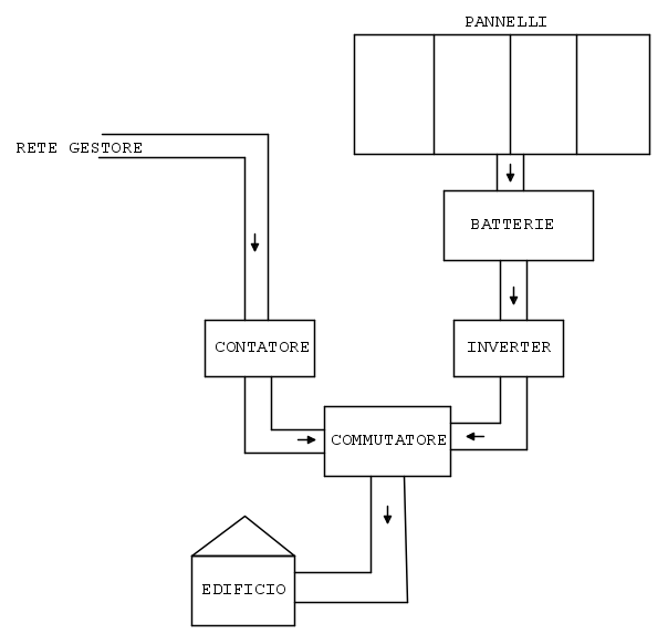 Fintanto che la fonte fotovoltaica è in grado di soddisfare le richieste di carico, provvede lei ad alimentare il carico (appartamento), se il carico supera la potenza che il fotovoltaico può offrire avviene una commutazione sulla rete del gestore scollegando il fotovoltaico che nel frattempo ricarica le batterie.