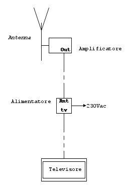 dove l'antenna va collegata all'ingresso dell'amplificatore da palo nella banda corrispondente, e dall'amplificatore da palo con l'uscita si va giù al tv dove è presente un alimentatore da antenna, il quale ha una connessione per il cavo proveniente dall'amplificatore contrassegnato con Ant, ed un uscita per il cavo che va al tv contrassegnato con TV, e poi una presa di alimentazione di rete che andrà connessa alla rete di 230 V.