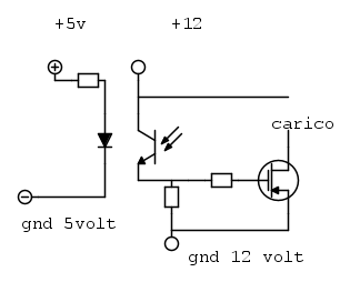il led del fotoaccopiatore ( uso dei 4n35 )e' alimentato tramite arduino a 5 volt.i carichi sono a 12 volt.