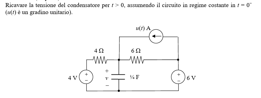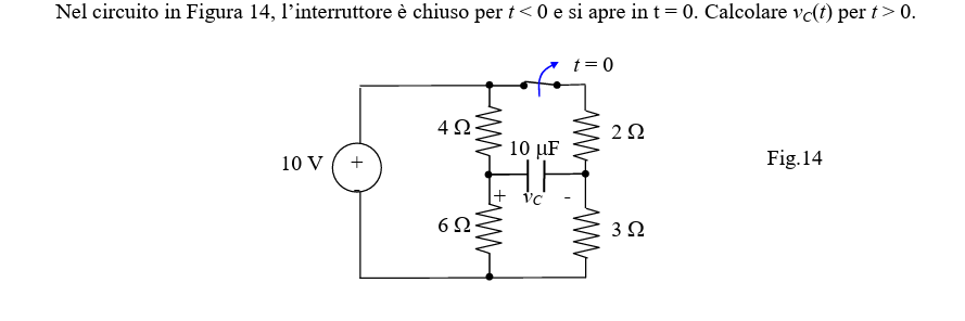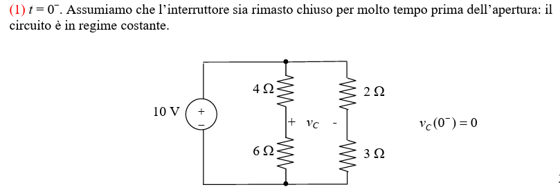 Vi voglio allegare un problema simile per capire la differenza: Qui dice che la tensione a tempo 0^- è 0 ,senza fare calcoli. Va bene che posso vedere il condensatore come un circuito aperto , ma la tensione qui non è calcolabile ? Qui non viene spiegato il perché è subito 0.Non può essere vista come la tensione ai capi dei resistori?