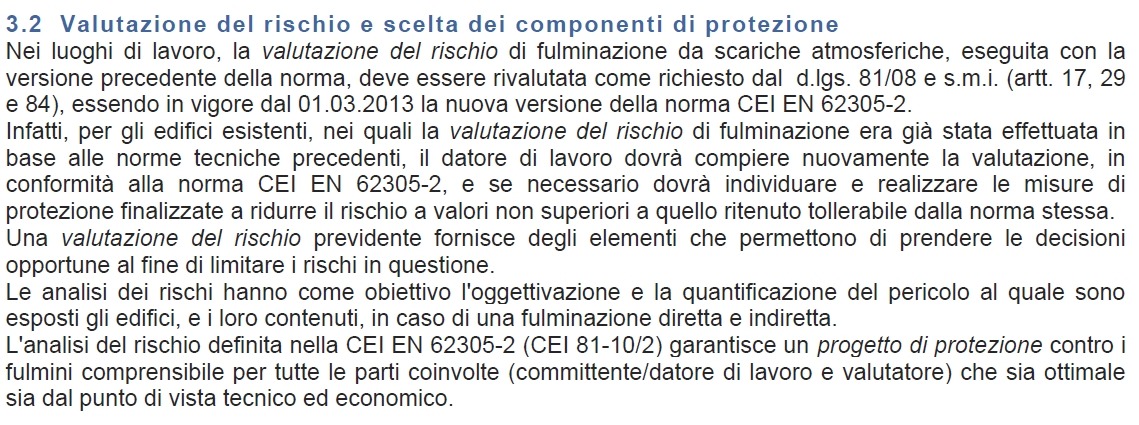 fuspietto ha scritto:Alla fin fine è proprio questo il punto della discussione: nel momento in cui io, professionista, vengo incaricato di redigere un progetto di modifica di un impianto elettrico, la legge mi impone di includere al suo interno anche la progettazione dell'eventuale impianto per la protezione da scariche atmosferiche. Ma questo impianto deve essere considerato sulla base di una valutazione del rischio fatta, precedentemente, dal cliente stesso. Se questa valutazione non esiste quale "eventuale impianto di protezione contro le fulminazioni" vado a progettare???