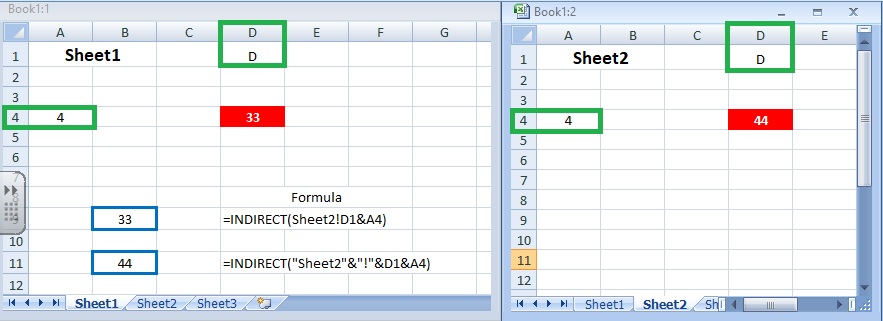 Cosa significa? Concatena il contenuto di D1 dello sheet2 al contenuto di A4 dello sheet1. Hai formato "D4". Quale D4? Quello dello sheet1. La funzione mostrerà il valore 33.