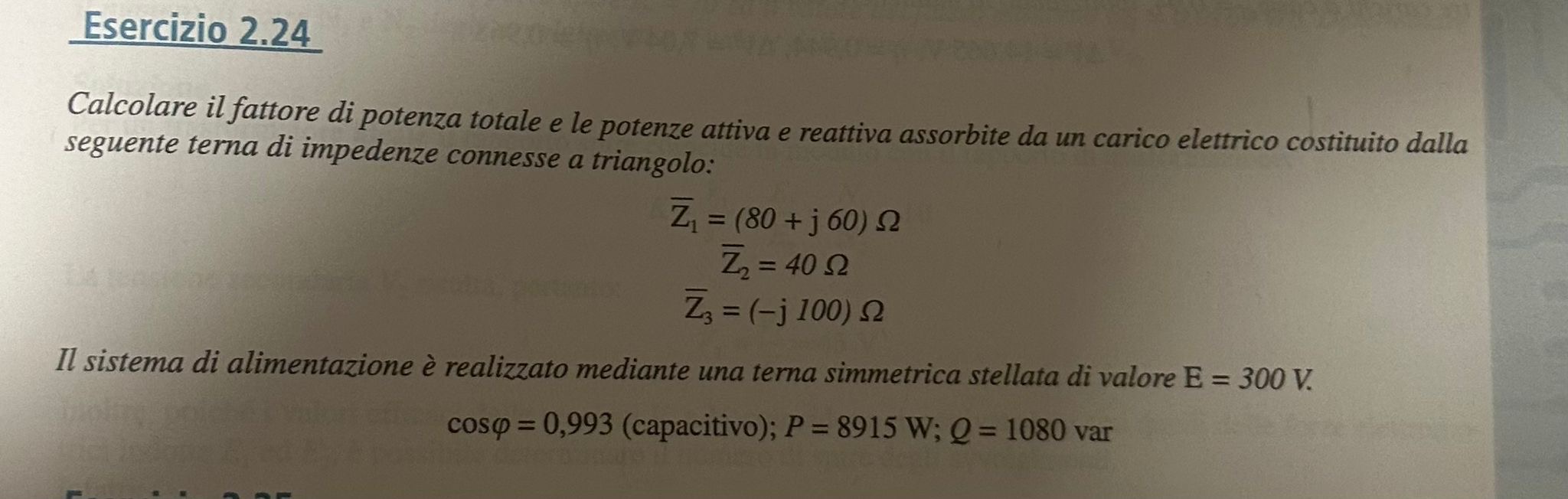 Devi calcolare, utilizzando la V fornita dal testo, le correnti a triangolo che circolano su ciascuna delle impedenze, calcolare poi la potenza totale attiva e reattiva (con Boucherot), calcolare poi il fattore di potenza totale