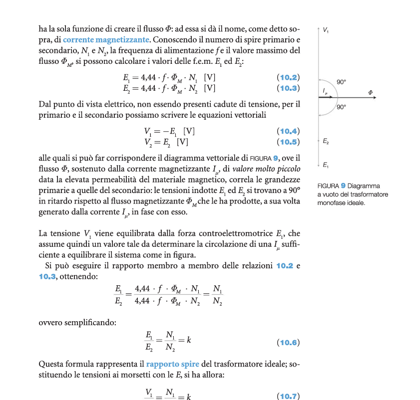 La Iµ è quella che genera il campo magnetico nel nucleo e per autoinduzione dell'avvolgimento primario si genera E1 che si contappone a V1 (perché perfettamente in fase), quindi non si ha nessuno scorrimento di corrente in fase con la V1, ma solo la Iµ sfasata di 90° quindi completamente reattiva.