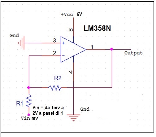 Lo schema è giusto, però, essendo un invertente alimentato a tensione singola non può fornire un'uscita negativa rispetto a GND. La tensione in ingresso deve essere per forza negativa (da -1 mV a -2 V). Ma comunque una volta arrivati a -0.477 V l'uscita avrà già il suo valore massimo di 4.77 V. Per andare oltre occorre aumentare la Vcc.