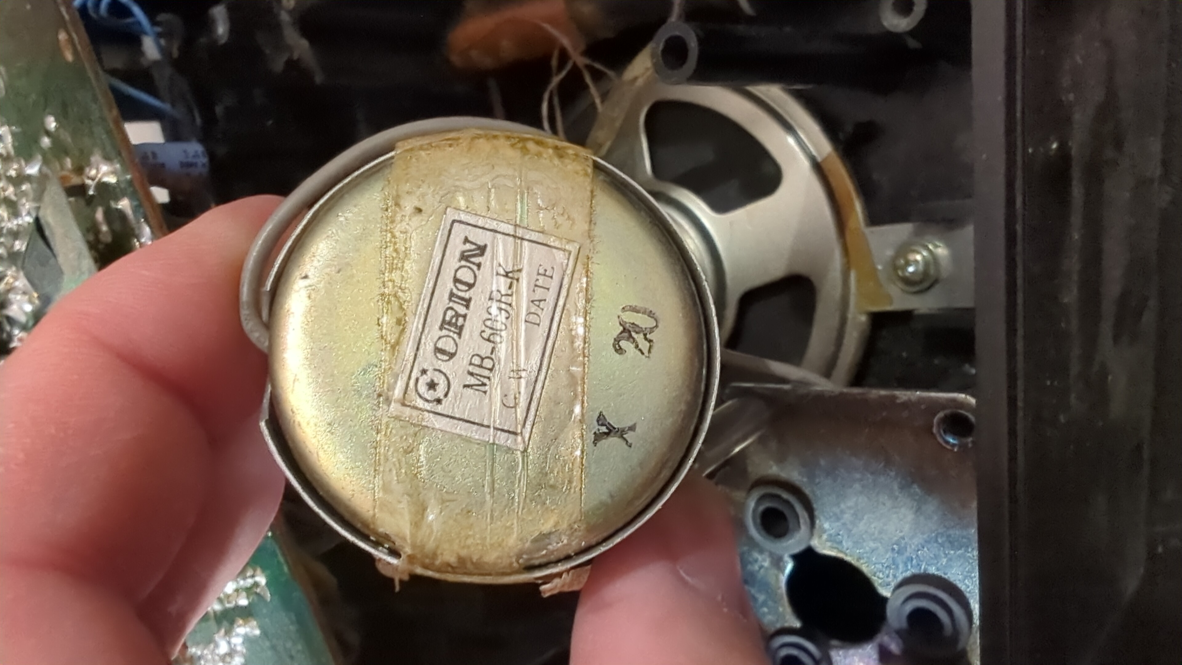 In alcuni casi, raramente, il foro era laterale, o sotto l'etichetta, oppure serviva togliere il "tappo" posteriore per accedere (il tuo potrebbe essere uno di questi, ad esempio), sarebbe da controllare (nel caso non ci siano vitine, e nel tuo non ne vedo, potrebbe essere semplicemente incastrato a pressione, o tenuto dal nastro adesivo)