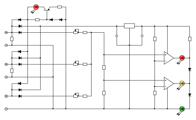Il circuito sfrutta le diverse cadute di tensione dei LED di diverso colore per ottenere lo spegnimento del LED verde quando si accende il giallo, e lo spegnimento del giallo quando si accende il rosso. Se le differenze in caduta di tensione non fossero sufficienti, si possono aggiungere dei diodi (indicati con "Not necessary?") per aumentarle.
