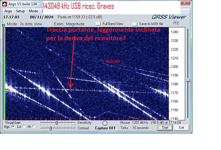 Il ricevitore è sintonizzato su 143049 in USB, quindi la portante si riceve a circa 1kHz ( 1100, forse dovuta alla imprecisione del ricevitore che riceve 100 Hz sotto la frequenza impostata). Oppure sono tutti disturbi locali?.