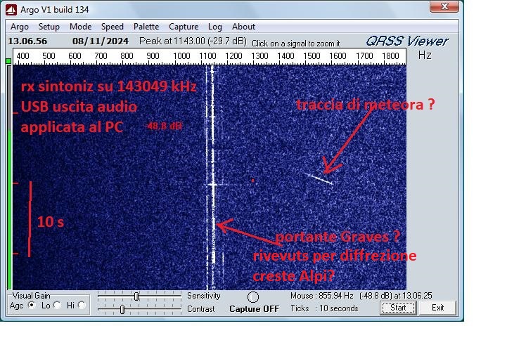 Il ricevitore è sintonizzato su 143049 in USB, quindi la portante si riceve a circa 1kHz ( 1100, forse dovuta alla imprecisione del ricevitore che riceve 100 Hz sotto la frequenza impostata). Oppure sono tutti disturbi locali?.
