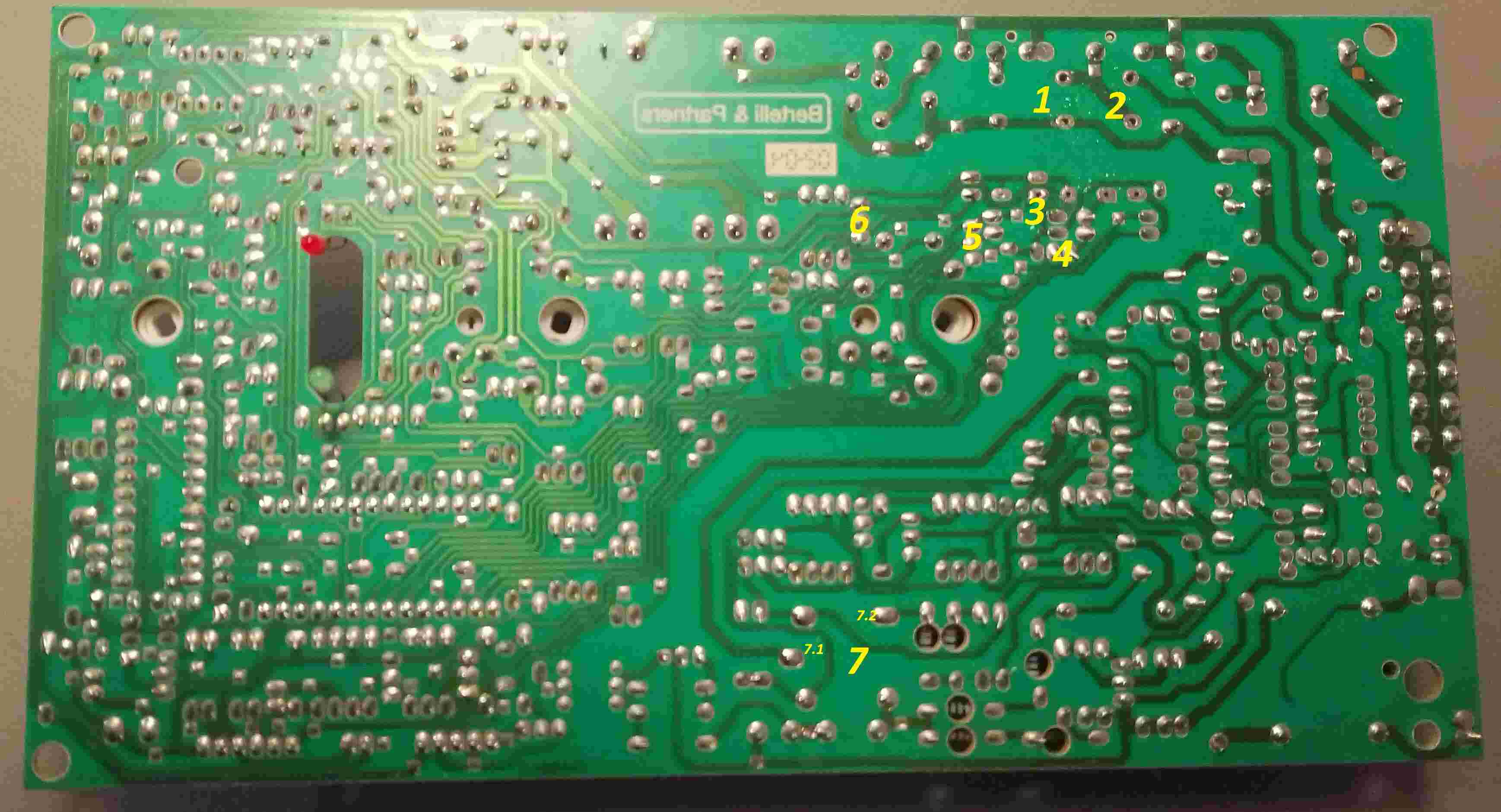 7) Relé guasto Panasonic JS1-48V sostituito con equivalente. Il relé è normalmente chiuso e quello guasto, se eccitato, non chiude il contatto NO (7.2 in foto retro scheda)