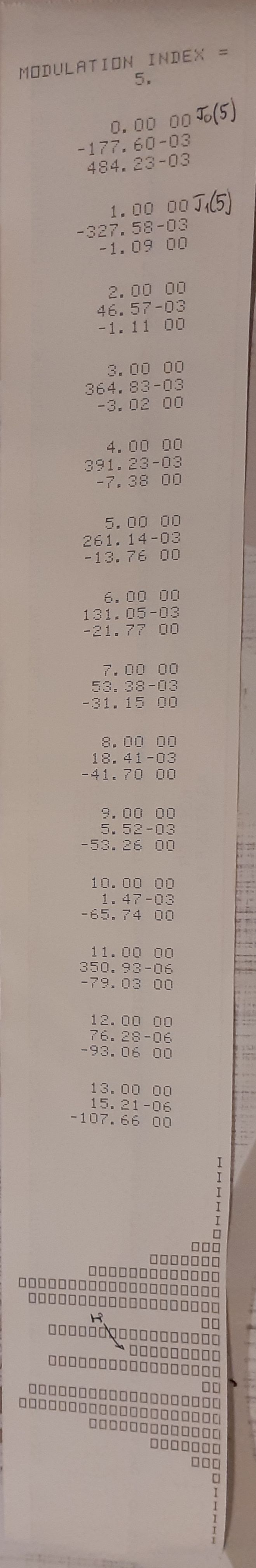 Di seguito il listato che si ottiene col mio programma che ho scritto sulla mia TI-59: dato l'indice di modulazione calcola i coefficienti Jo..Jn e la potenza residua (ovvero: per un indice di modulazione pari a 5 (m=5) stampa n, Jn(5) e la potenza residua in dB nelle componenti spettrali successive) .