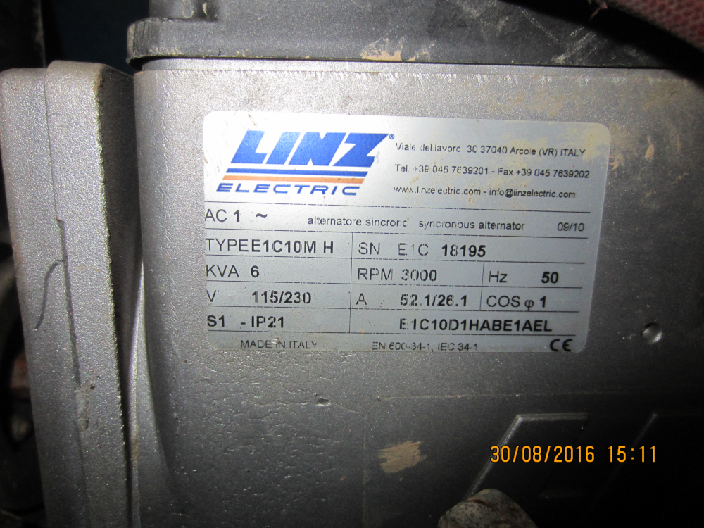 Il motore è un diesel monocilindrico Ruggerini RF90 da 3000 giri e le caratteristiche dell'alternatore sono quelle in foto.