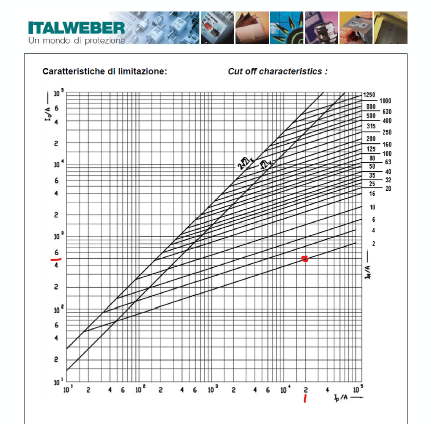 Esempio: considerando la caratteristica di limitazione riportata nel data sheet allegato, con una corrente di corto circuito di 20 kA, un fusibile da 2 A limiterebbe tale corrente a 500 A.