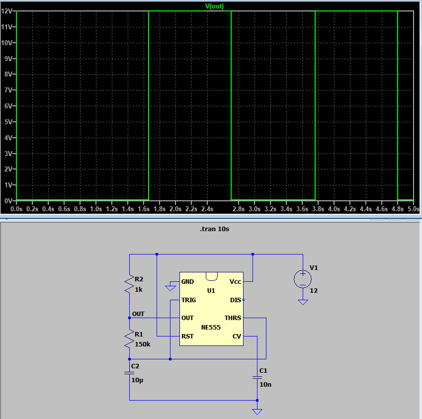 Ho fatto una simulazione per l'astabile che si occupa del lampeggio a 1Hz, effettivamente con quella configurazione riesco a ottenere un duty esattamente del 50% a una frequenza di 1Hz, unica pecca che mi rode un po' (ma non è poi cosi grave) il lampeggio inizia dopo circa 1660 ms: