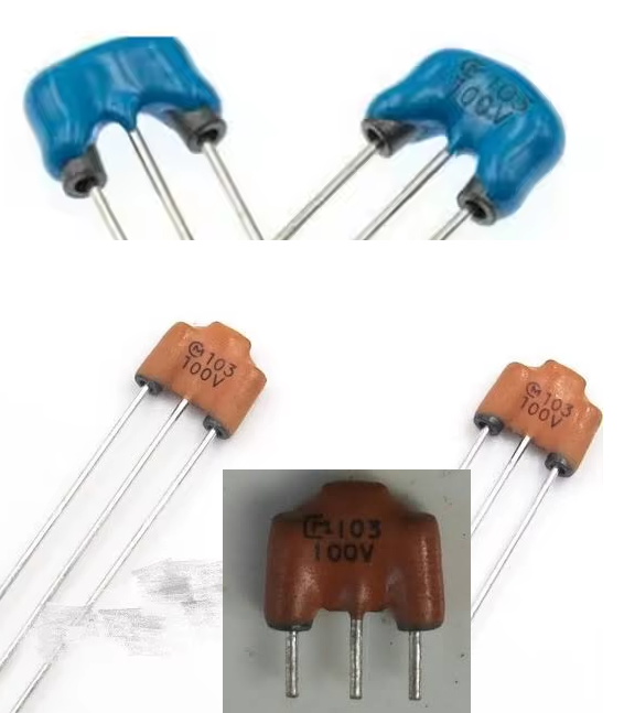 Si, in genere sono filtri RF, antidisturbo, che si usano per disaccoppiare stadi RF o che generano disturbi dalla linea di alimentazione ... di solito sono filtri a T, in pratica un semplice ponticello di filo piegato ad U, sui due terminali della U infilano una o due perline di ferrite (che diventano induttanze), mentre al centro della U collegano un condensatore (sul tuo leggo 102, quindi 1nF) verso massa (c'e' solo il valore del condensatore perche' non avrebbe senso mettere il valore di un ponticello di filo