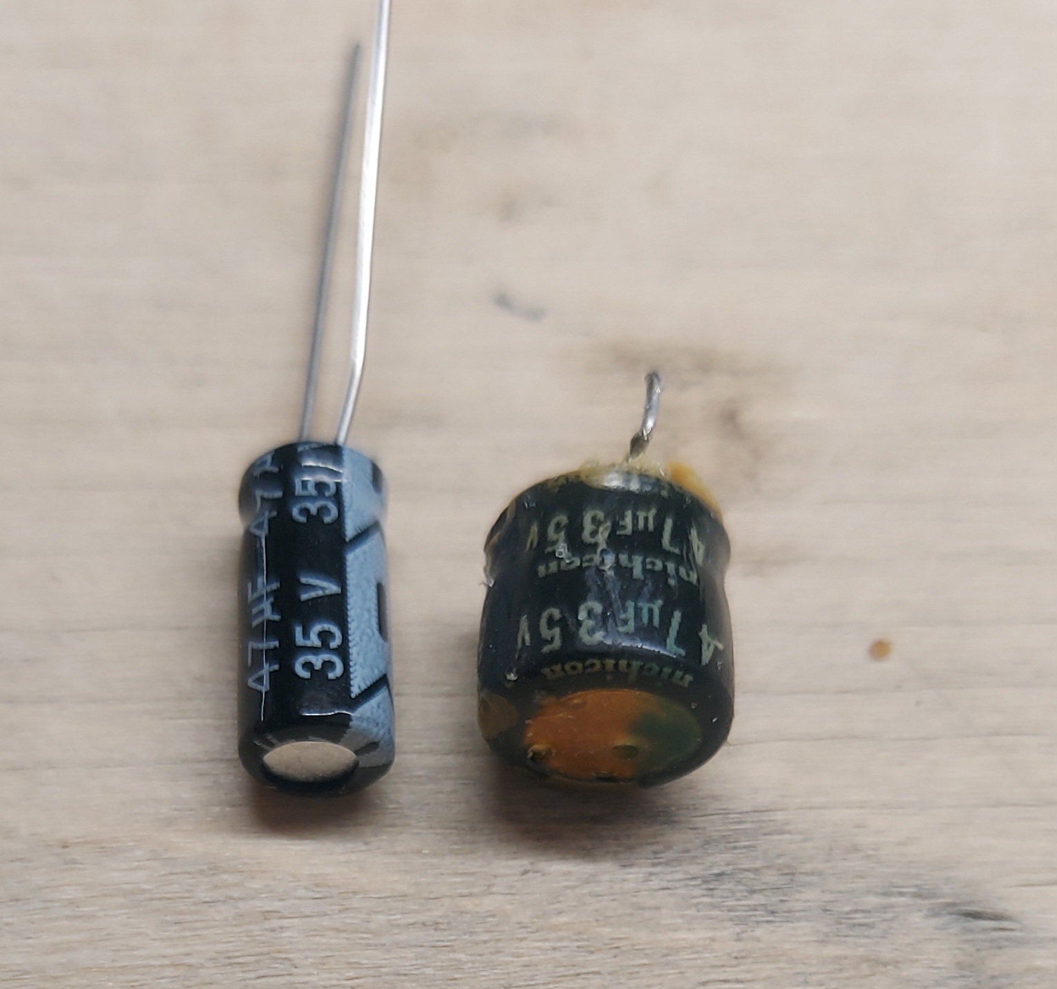 E conta anche CHI produce il condensatore: l'originale in foto è un ottimo Nichicon, il sostituto sembra un normale elettrolitico a basso costo. Se riesci a far ripartire il tutto, assicurati di montare condensatori di ottima qualità, visto l'impiego in ambiente gravoso