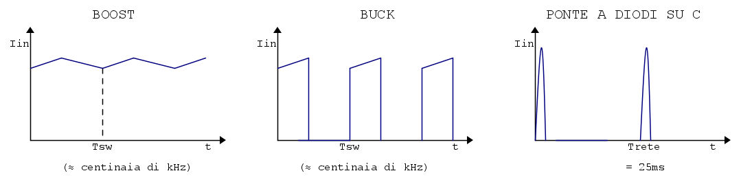 Inoltre l’utilizzo di una topologia boost consente di avere una corrente in ingresso continua (l’induttanza è collegata direttamente all’ingresso), per cui il contenuto armonico è più povero di componenti ad alta frequenza causate ad esempio da spike di accensione/spegnimento improvvisi degli switch (come ad esempio in un ponte a diodi su C oppure in un buck, dove hai dei ripidissimi di/dt).
